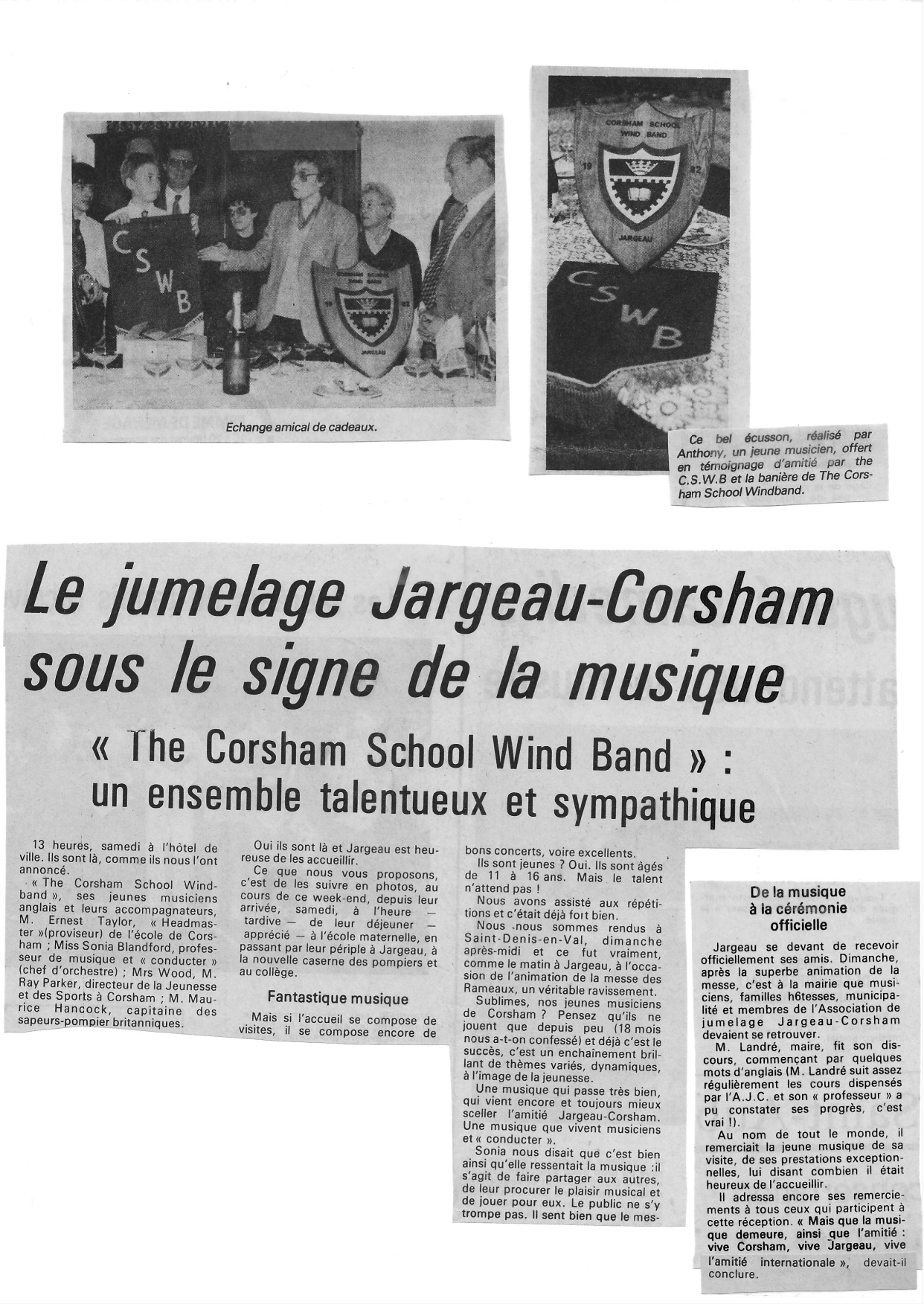 This article (in French) was published in the "République du Centre" newspaper on 4th April 1982 when two members of the Corsham School Windband (as the CWA was known at that time) presented a hand-made wooden shield to the Mayor of Jargeau M. Landré.