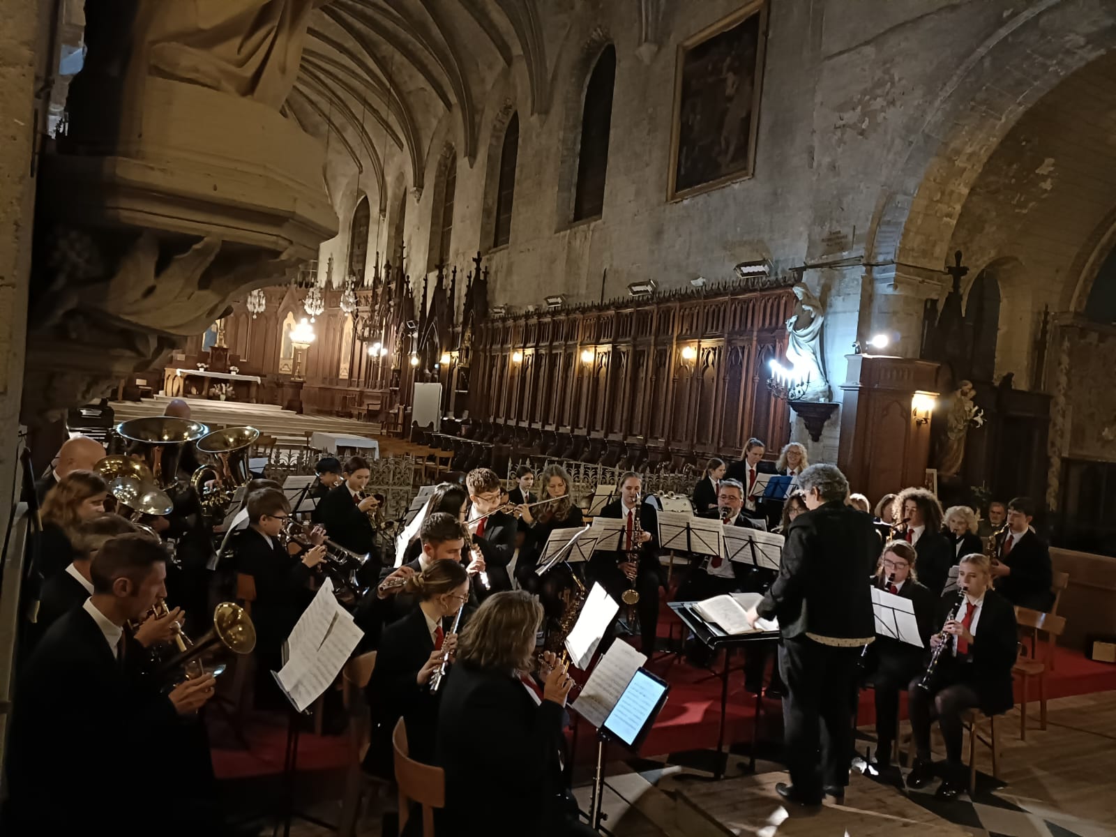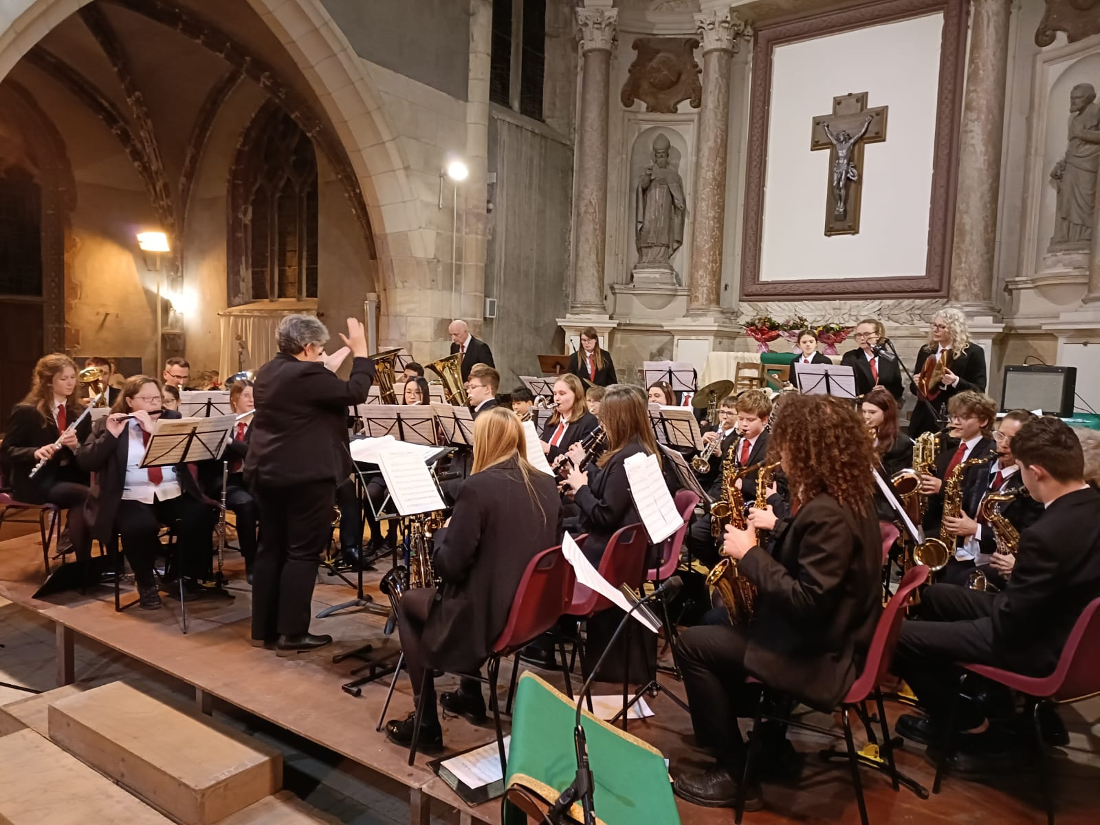 With the Mayors, Deputy Mayors of Jargeau and Châteauneuf sur Loire, members of the Jargeau Twinning Committee and an audience of local families in attendance, the band performed concerts in Jargeau, Chateauneuf and Orléans. Our musical repertoire was described as joyous and infectious, with standing ovations at each event.  Forty playing members, supported by parents and friends performed a selection of film music including Les Misérables, Pirates of the Caribbean, West Side Story, ending with the electrifying Pink Floyd Medley.  The Youth Concert Band Saxophone Choir debuted with a complex arrangement of ‘Top Cat’.