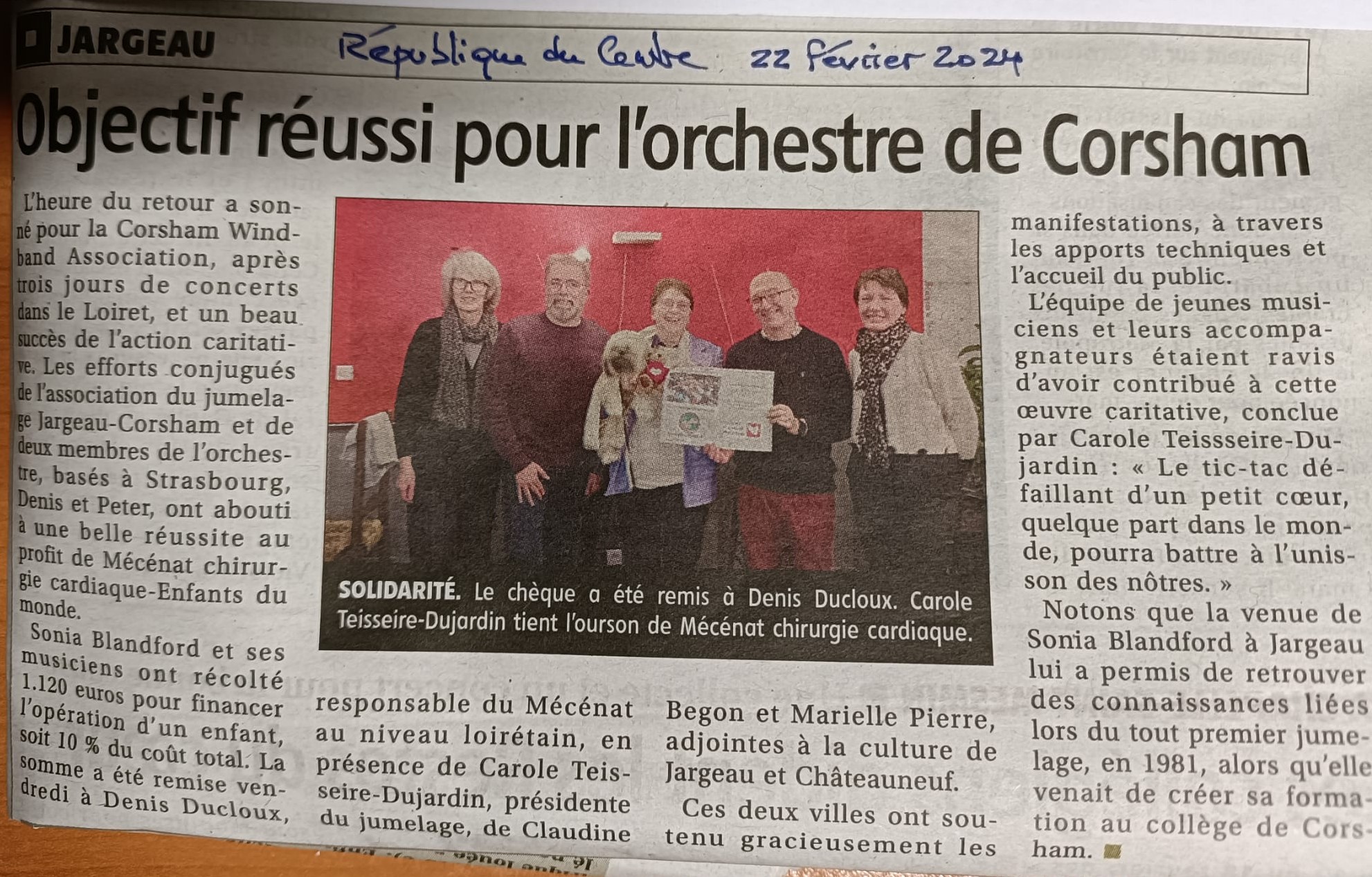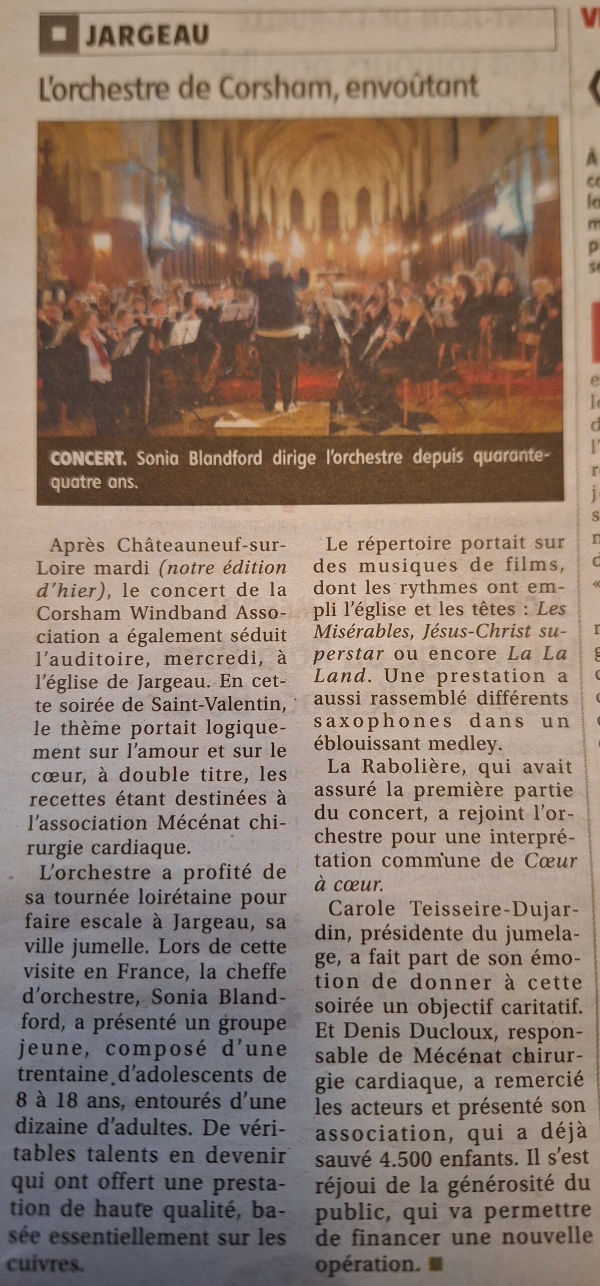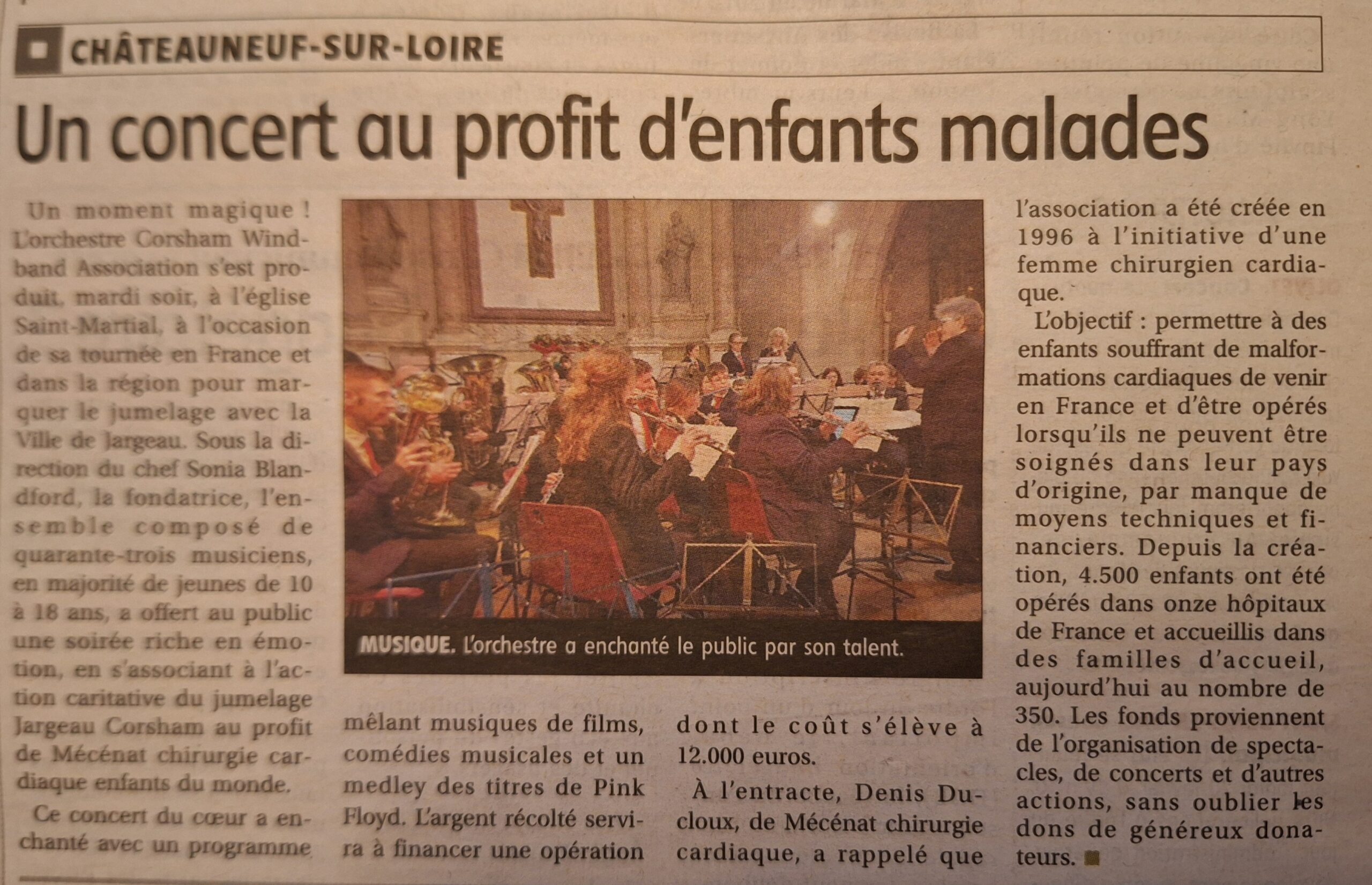 A total of five articles were published in the regional newspaper "La République du Centre" about Corsham Windband Association, Jargeau Twinning committee and the money raised during the concerts in favour of the association Mécénat Chirurgie Cardiaque.